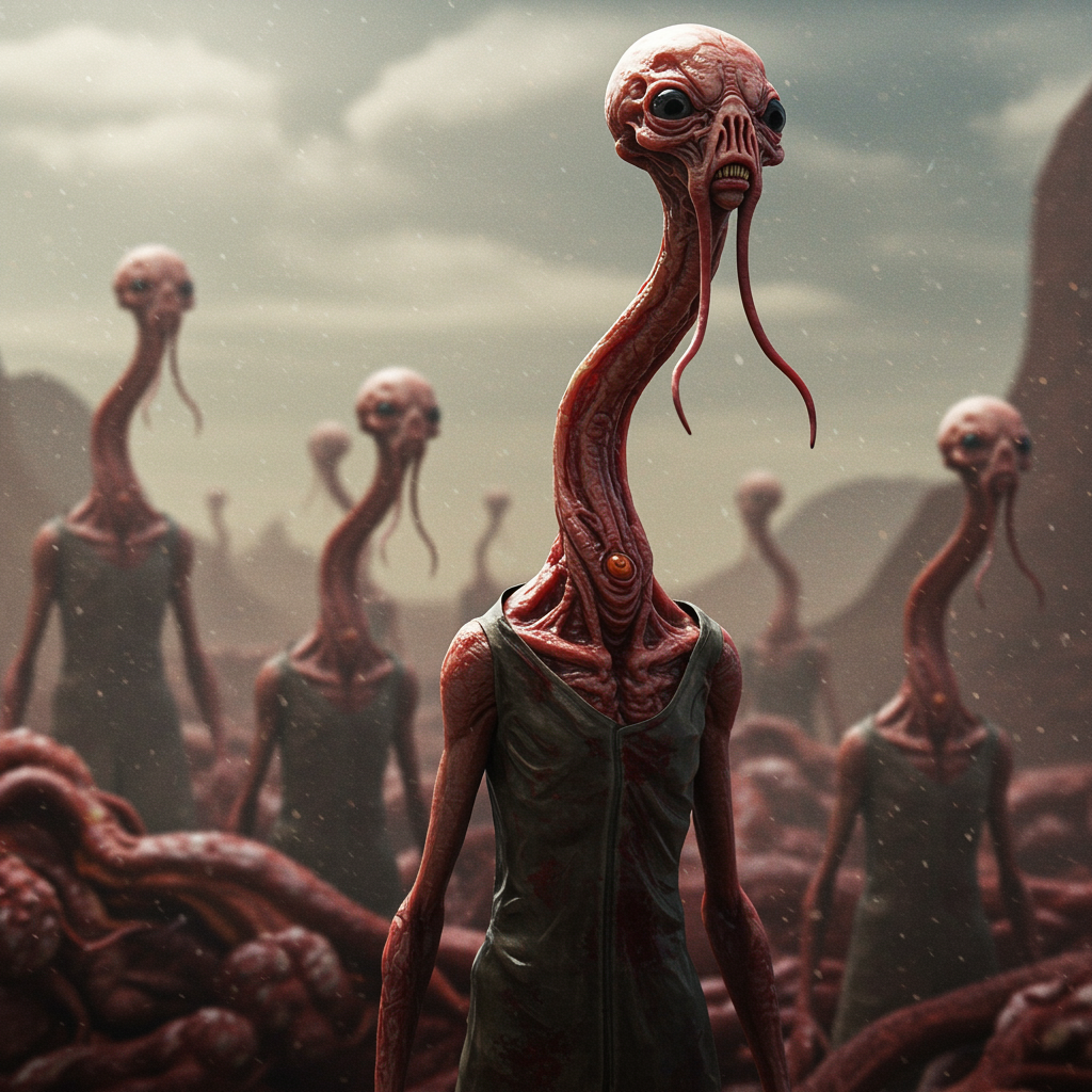 Sci-Fi, Hyper-realistic, Detailed, Cinematic Lighting, Dramatic Scene, Sharp Focus, Depth of Field, IMAX, UHD, HDR, 8K, with ReV Animated v1.22 influences, depicting a mutated and disfigured futuristic landscape, featuring unique characters with distinct mutations like elongated necks and extra fingers, offering a surreal aesthetic. Avoid elements that detract from realism such as low resolution, out of frame subjects, and visual disruptions like blurry spots or watermark interventions. Emphasize a cohesive and immersive vision, avoiding cartoonish aspects and ensuring all components are sharply defined and seamlessly integrated.