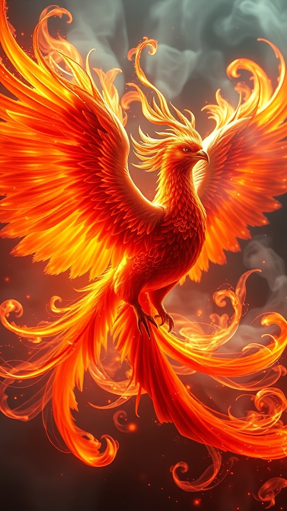 View this AI-generated image featuring a breathtaking and magnificent phoenix igniting into a mesmerizing dance of flames inspired by greg rutkowski embodying luxury and elegance with ornate vibrant and vivid hues its smooth feathers merge with soft billowing smoke casting a bright and ethereal glow
