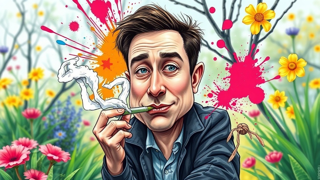 A humorous and highly detailed digital illustration of Elon Musk smoking a blunt in his garden during springtime. The setting is bright and vibrant, with a saturated color palette that brings the scene to life. The caricature captures Elon making eye-contact with a mischievous expression, surrounded by an explosion of paint splashes and ink strokes, adding to the creative chaos. In true caricature fashion, his face and features are exaggerated with humor, while his hands and feet are intentionally poorly drawn, adding a touch of absurdity. Elements of fine art blend with whimsical pencil strokes, presenting a vivid yet intentionally imperfect depiction. Extra limbs and disfigured features comically peek out from the frame, while blurred and grainy areas add to the whimsical nature of the artwork. There is a humorous draft-like quality with a hint of a watermark, enhancing the parody. The artwork is dynamic, centered, and brimming with creative alterations that maintain the core concept while playfully distorting reality.
