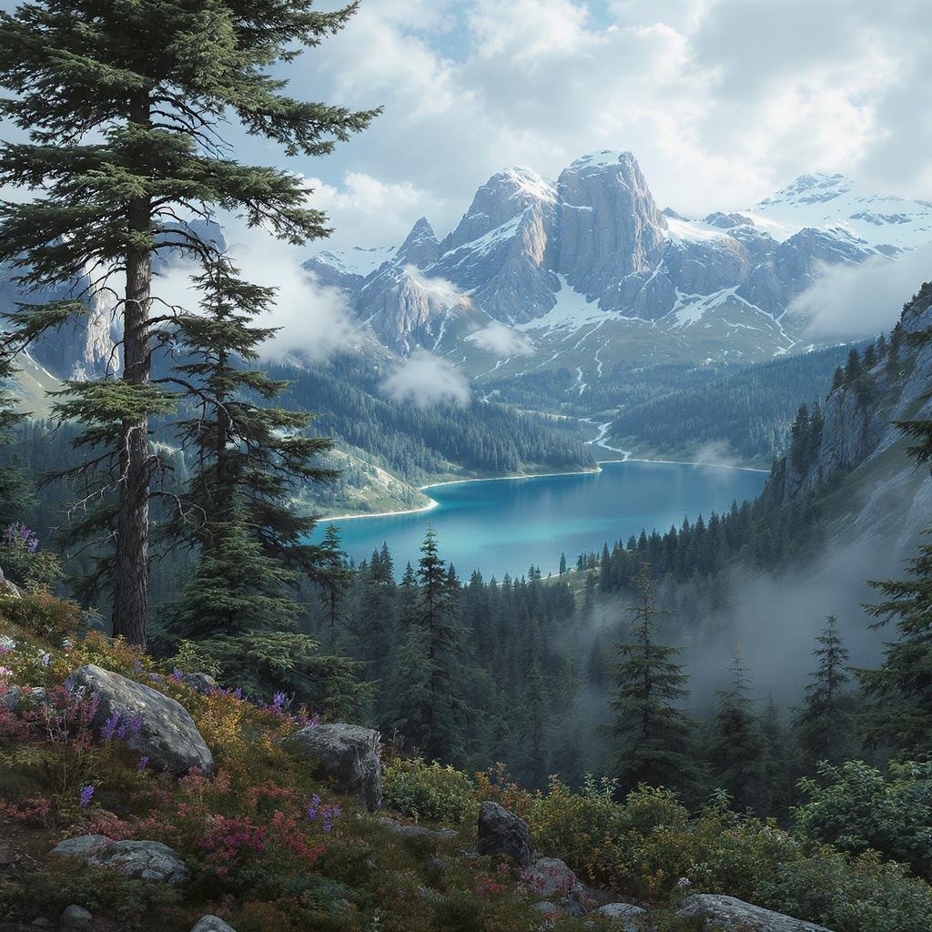 View this AI-generated image featuring a breathtaking landscape unfolds featuring a serene forest atop rolling hills adjacent to a glistening lake reminiscent of mark lague s painting style this masterpiece captures the essence of nature with high quality extremely detailed cg design suitable for an