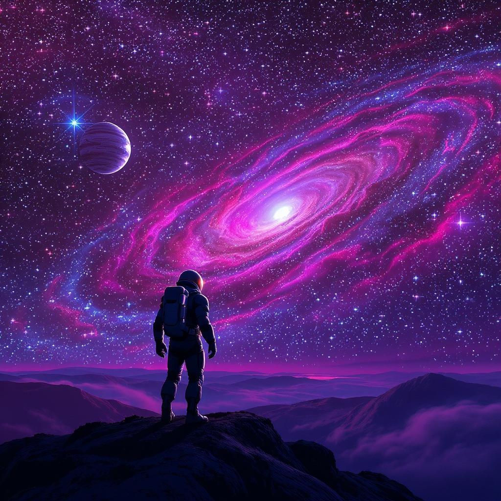 View this AI-generated image featuring a lone astronaut in a futuristic space suit gazes from a hilltop at a vibrant neon lit cosmos the scene is inspired by metal album art capturing a sense of wonder and the infinite possibilities of outer space the universe is depicted in a rich tapestry of dark