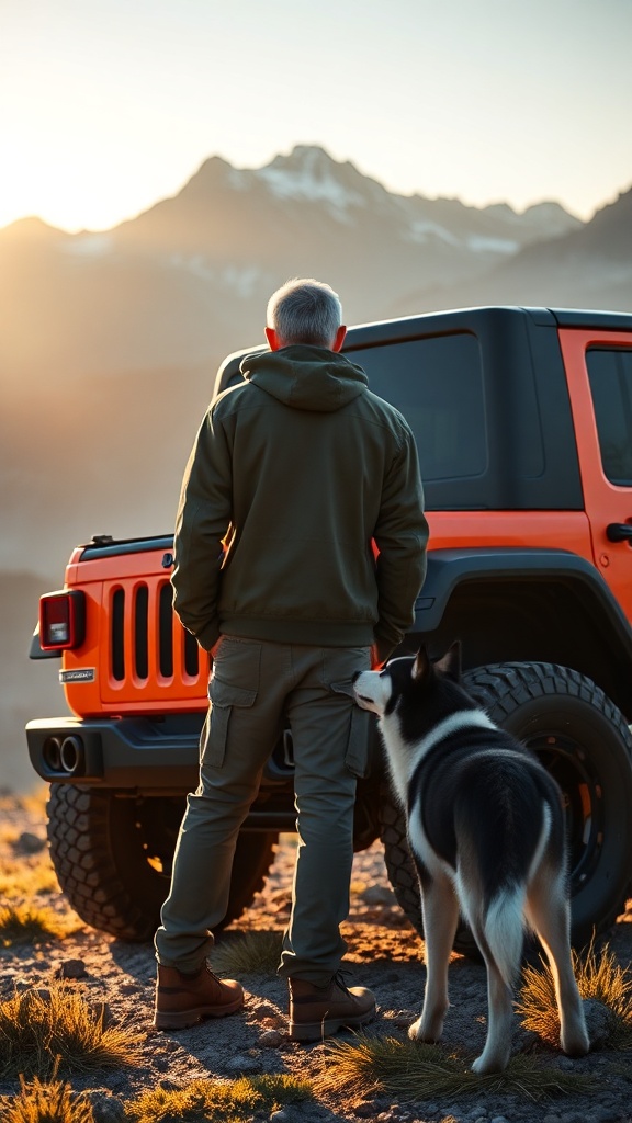 Capture the essence of a stunning and ultra-realistic scene featuring a Jeep Rubicon in a breathtaking landscape. The early morning sun casts dramatic and cinematic light, bathing the setting in a soft, pale glow. The view is from a low angle, showcasing the Jeep's intricate details with hyper-realistic precision, rendered in Unreal Engine 5 with inspiration drawn from Studio Ghibli and John William Turner. A medium-built man with very short gray hair stands with his back to the viewer, absorbed in the majestic beauty of the Cantabrian landscape, gazing across the awe-inspiring Picos de Europa. The Jeep Rubicon, painted in vibrant orange and equipped for tough off-road expeditions, rolls on rugged Pirelli SCORPION™ ALL TERRAIN PLUS tires. Beside the man, his Siberian Husky with a striking dark brown and white coat watches the mountainous vista with attentive curiosity. The man is clad in practical outdoor gear—a wind-resistant jacket, cargo pants, and sturdy trekking boots—ideal for exploring this remote and rugged terrain. The atmosphere is captivating, with lush, verdant mountain slopes stretching out beneath a moody, cloud-speckled sky, as the majestic peaks of the Picos de Europa loom in the distance.
