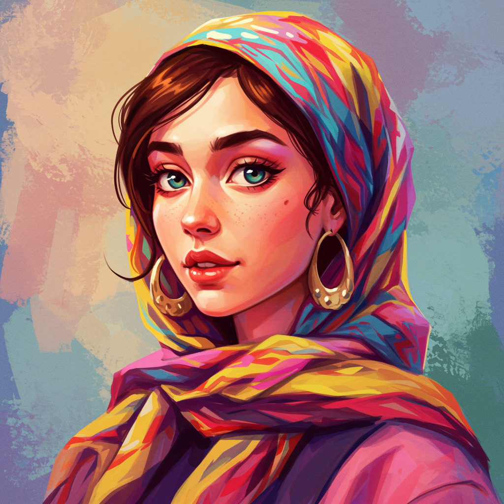 View this AI-generated image featuring a vibrant digital painting of a woman with a colorful headscarf capturing a fusion of styles inspired by rossdraws and artgerm with hints of atey ghailan s softness and lois van baarle s ethereal touch the portrait is dynamic and cartoon like showcasing a youth