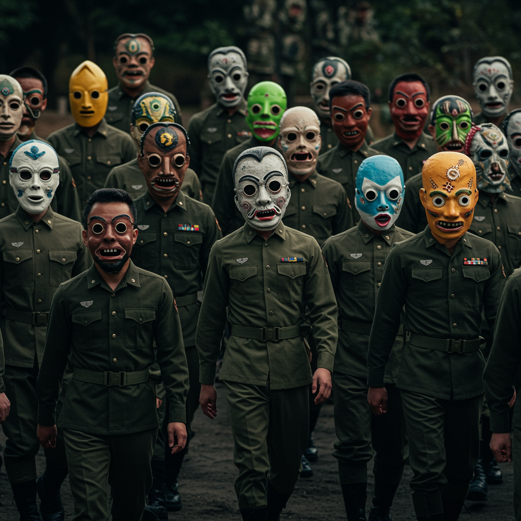 View this AI-generated image featuring a diverse army of men from various ethnic backgrounds marches in unison each wearing a distinctive mask inspired by tyler the creator s chromakopia their uniforms reminiscent of korean military attire create a striking visual contrast against the intricate desi