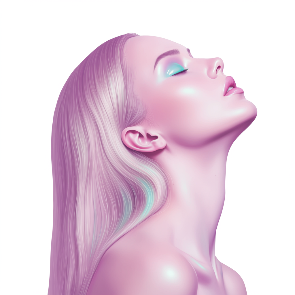 A surreal portrait of a woman with her head dramatically tilted back against a stark white background, her hair cascading in exaggerated, smooth and flowing lines that resemble wisps of smoke. Her features are elongated and abstracted, with eyes that shimmer like pools of color and lips that gently curve, offering an expression of serene introspection. Her skin possesses an ethereal glow, reminiscent of moonlight on water, creating an otherworldly aura. The pastel palette, featuring soft hues of lavender, blush pink, and aqua, melds together to evoke a sense of calm and tranquility. The photorealistic texture captures every facet of detail, showcasing the tension and softness in her neck and shoulders, with shadows that dance delicately across her glowing skin, enhancing the rich detail of the 4K UHD rendering.