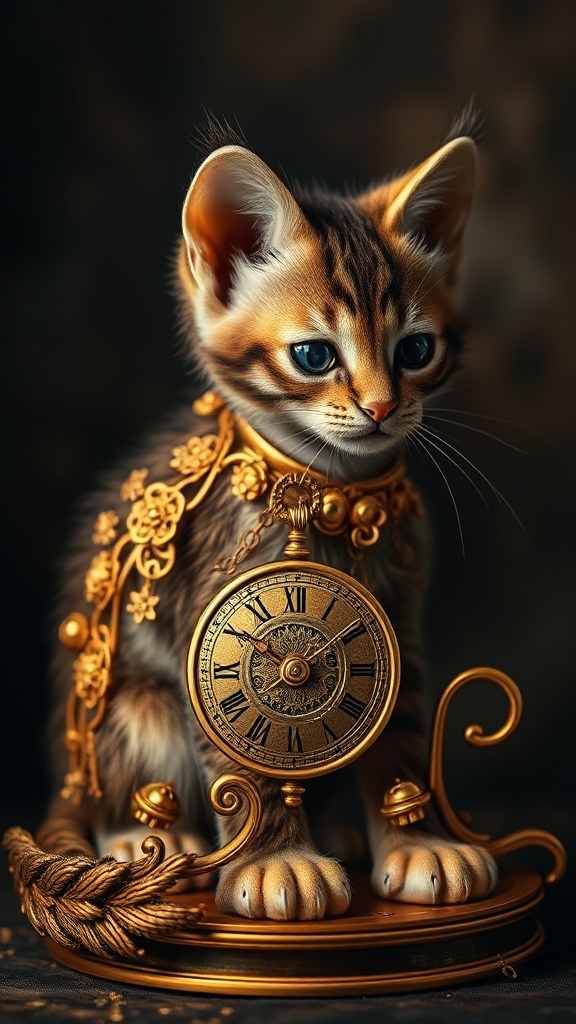 View this AI-generated image featuring a kitten crafted from intricate gold clockwork adorned with delicate golden filigree set against a rich abstract dark backdrop the scene captures the essence of chiaroscuro with high detail and photorealistic hyper realistic features the image exudes a sense of