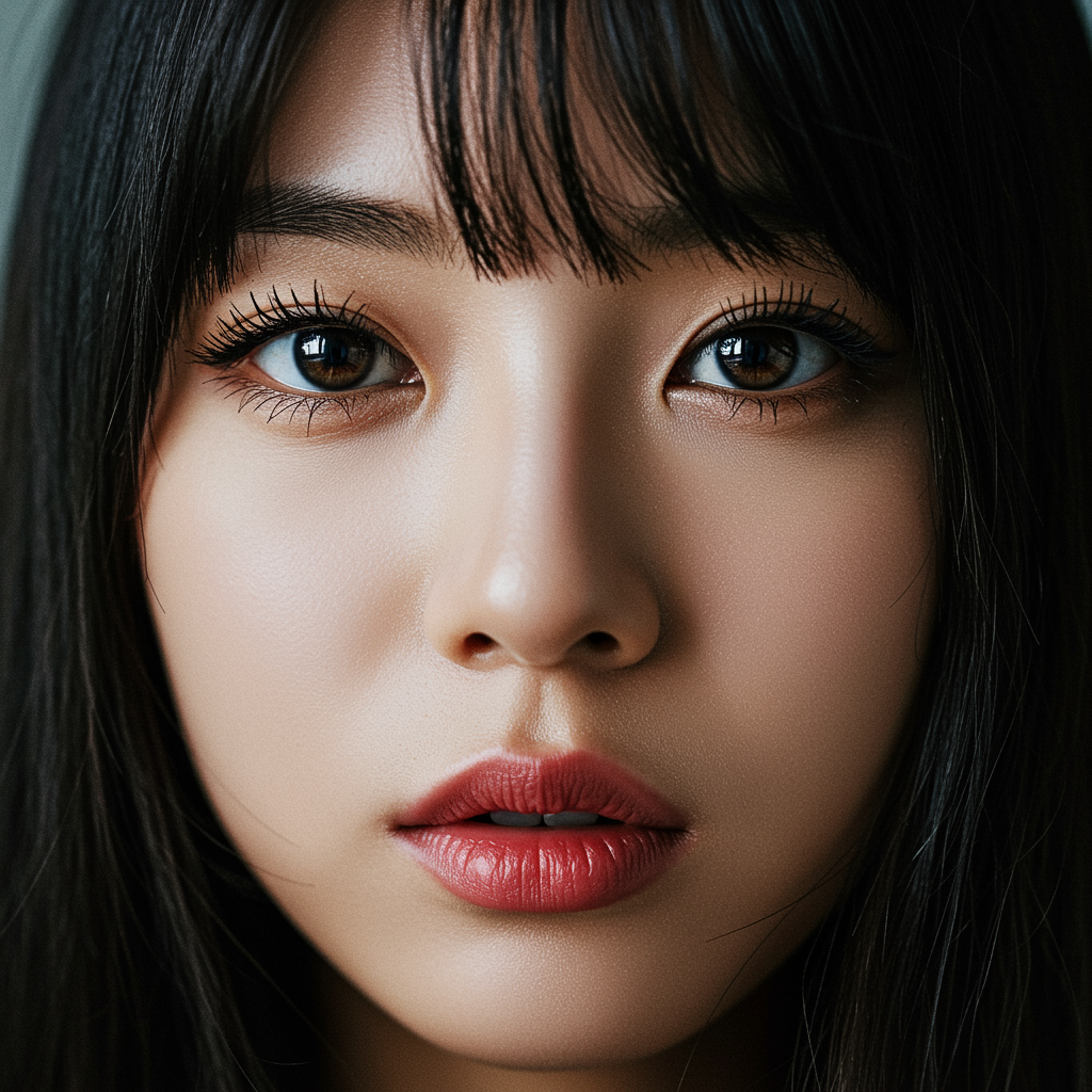 A stunning Korean woman, K-pop idol, featuring symmetrical eyes, ultra-high resolution, photorealistic 8k image, hyperrealism with dramatic lighting that showcases the artistry of photography, utilizing physics-based rendering for the best quality. This professional close-up photo highlights beautiful, detailed eyes, capturing the essence of ulzzang beauty. Avoid elements like CGI, 3D, doll, cartoon, anime, illustration, drawing, digital art, digital painting, sketch, low resolution, text, cropped, jpeg artifacts, unappealing features, duplicates, poorly rendered hands or face, deformed aspects, blurriness, logos, disproportionate hands, unattractive mouths, or unappealing eyes.
