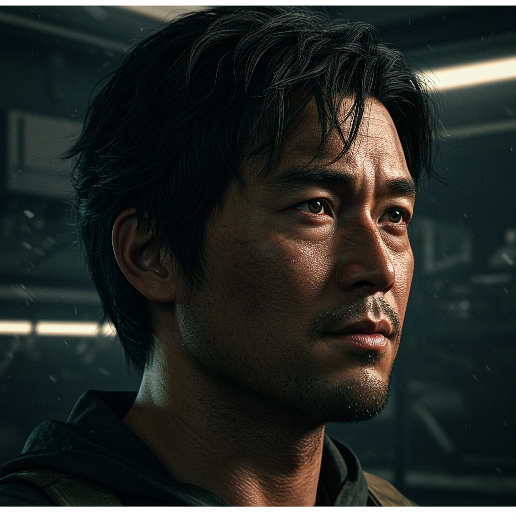 A cinematic three-quarter close-up portrait of a ruggedly handsome 30-year-old Asian man, his face stunningly detailed and lightly dirtied, exuding a mysterious yet peaceful expression. His hair, slightly disheveled, catches the dramatic backlighting that emanates from the oppressive and contrasting sci-fi background, creating a gloomy yet mesmerizing atmosphere. This hyper-realistic image is captured from a low angle using a DSLR, with aperture set at f/7, shutter speed at 1/100 sec, and ISO 150. The shot boasts super detailed textures with natural reflections, cinematic anime lighting enhancing the scene's ambiance. The background contributes to a sense of intrigue and depth without overshadowing the subject. The overall composition avoids any elements of asymmetry, distortion, or anatomical inaccuracies, while achieving a balance of dramatic and serene qualities.