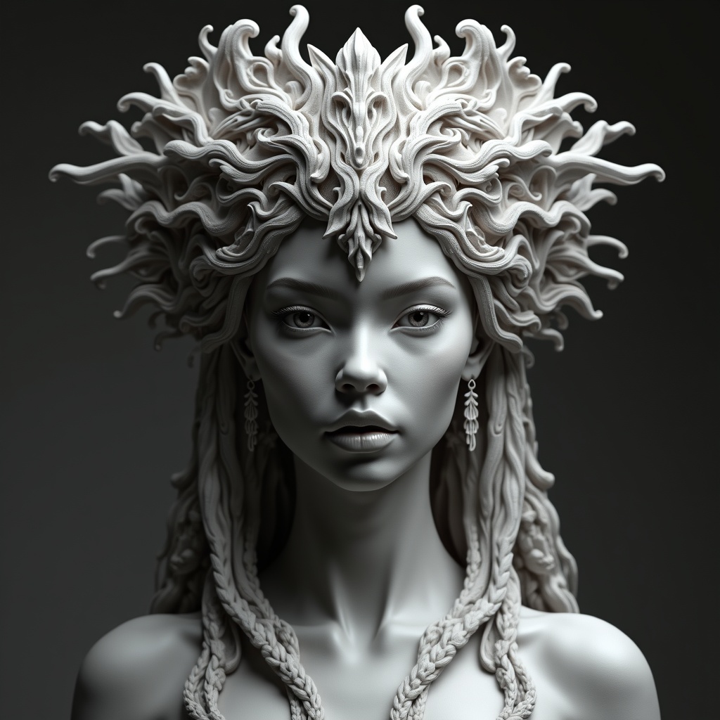 A hyper-realistic sci-fi sculpture of a woman with a stunningly detailed, elaborate crown, crafted in black and white. The crown, adorned with intricate designs reminiscent of nature's organic patterns, seems to merge seamlessly with her hair, each strand meticulously sculpted in a harmonious flow. Her calm, enigmatic expression conveys both strength and grace, enhanced by the delicate texture of her skin that captures the subtle play of light and shadow. The sculpture's futuristic aesthetic blends seamlessly with its lifelike detail, crafted as if it was molded by the forces of nature itself.