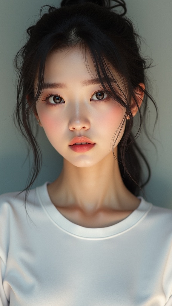 A stunning K-pop idol, a beautiful Korean girl, wearing a crisp white t-shirt, with captivating, detailed eyes. The image is a professional, high-detail RAW color photograph, showcasing ultra-high resolution, 8K detailed artwork with photorealistic digital art style, trending on Artstation. The scene is illuminated with cinematic high-contrast lighting, capturing lifelike skin texture and rich, vibrant colors. The photo is taken with a Nikon D850, using a Kodak Portra 400 camera with an f1.6 lens. The use of physics-based rendering and the Unreal Engine contributes to the hyper-realistic quality of the image, which is reminiscent of a fine art piece trending on Artstation.