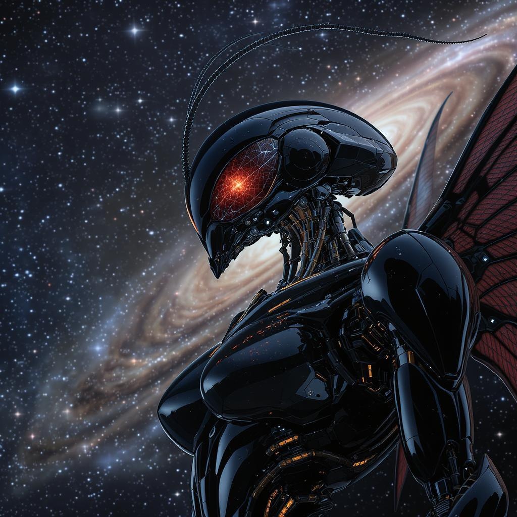 Portrait close-up of a streamlined Sci-fi mech, featuring a slender figure in three-quarters view. The design is a glossy black, highly reflective, and max detailed insectoid Sci-fi mech with intricate insectoid wings. Inspired by the styles of Tsutomu Nihei and Akira. The backdrop is a bright quasar light set against the vastness of outer space, with a dramatic and three-dimensional background. The art combines anime and manga drawing styles, illuminated by cosmic starlight, surrounded by galaxies and vibrant plasma rays. Captured in 8k UHD, offering hyper-realistic detail, as if shot with a digital Hasselblad H4D 200MS and Mitakon Speedmaster 65mm f/1 lens.