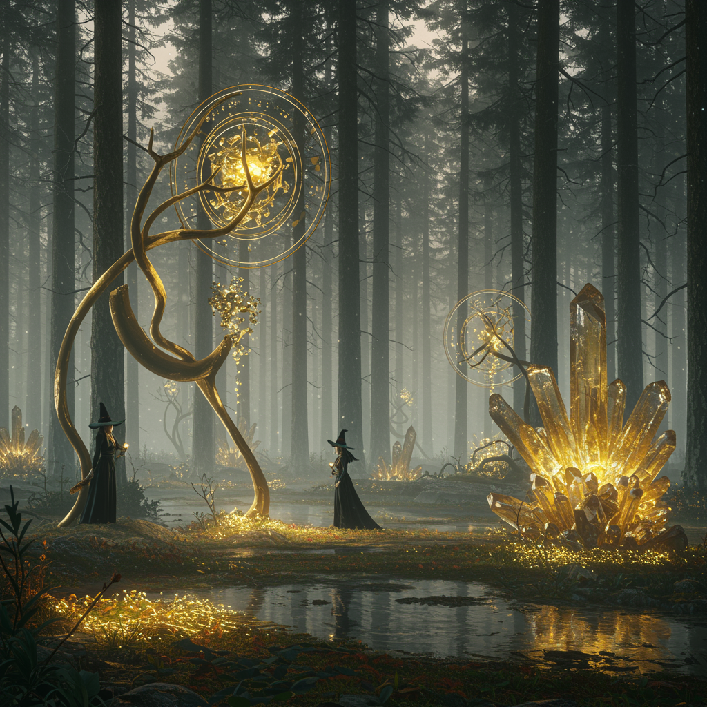 View this AI-generated image featuring forest fog enigmatic witches high contrast photography ethereal lights abstract forms intricate sketches shimmering waters industrial elegance golden hues crystalline treasures mystical allure fantastical realms cyberpunk vibes steampunk elements detailed conce