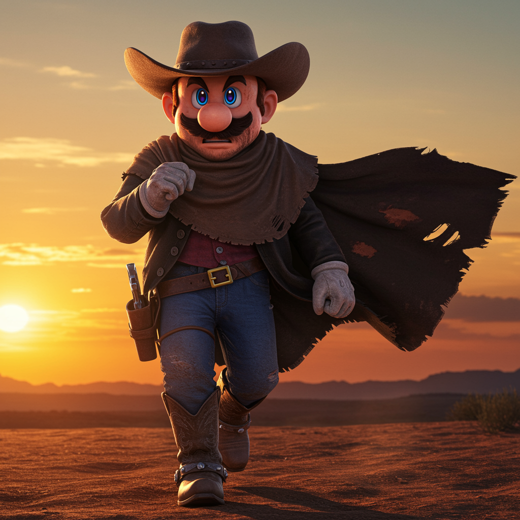 Super Mario transformed into a rugged cowboy from the Wild West, sporting a worn leather poncho draped over his shoulder, a wide-brimmed cowboy hat casting a shadow over his eyes. He wears sturdy cowboy boots with spurs that jingle subtly with each step, adding to his adventurous demeanor. His outfit is completed with a weathered black duster coat billowing in the wind, accentuating his motion. Mario's classic mustache contrasts with his new gritty look, yet his charismatic spirit remains. The sun sets behind him, painting the sky in shades of orange and red, capturing the essence of a cinematic motion picture shot.