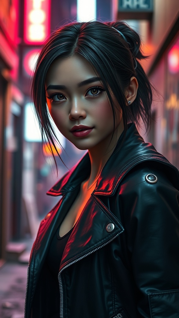 Pastel lighting, mysterious smile, bright and piercing eyes, a stunning young cyborg girl inspired by the style of Deus Ex Mankind Divided, wearing a stylish blown fashion magazine-style jacket set against a night city backdrop. She stands inside a dimly lit slum alley, showcasing her natural glossy hair with maximum authenticity. Captured with a 150mm lens, ISO 100, avoiding any imperfections such as bad clothes, poorly drawn clothes, broken fabric lines, JPEG artifacts, or matted hair. The composition is free of cropped elements, headphones, and anatomical errors such as extra or missing limbs, floating or disconnected limbs, ensuring a flawless and captivating image without any blurriness.