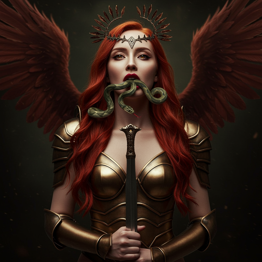 A warrior goddess with an angelic face, her fiery red hair cascading down her back. Her mouth is slightly open, revealing a serpent emerging from within. She has large, expressive eyes and a flawlessly smooth complexion. The full-body portrait captures a magical photographic essence with dramatic lighting, showcasing photorealistic details. The composition is an intimate, cinematic portrait with a subtle blend of tones and soft, even contrast.