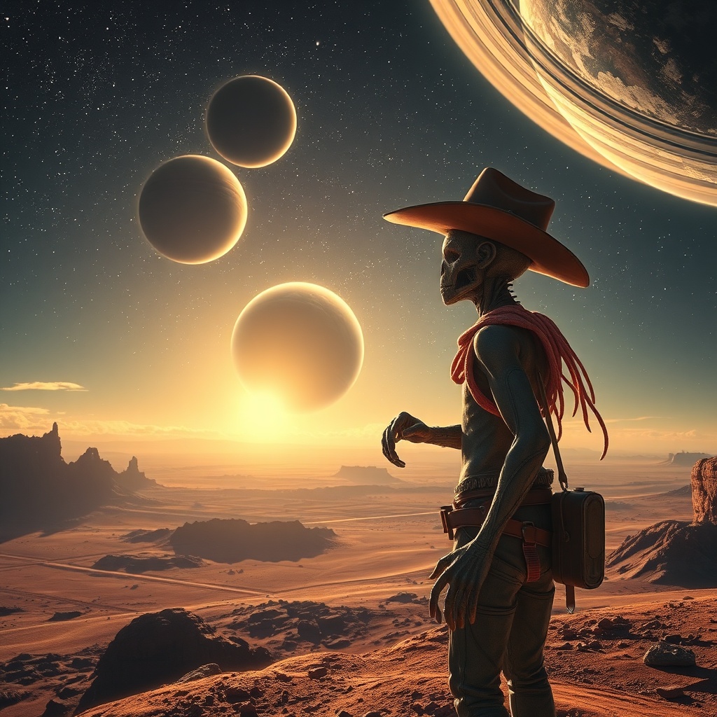 A breathtakingly detailed portrait of an expansive alien landscape, featuring a space cowboy gazing at the stars. In the sky, planets collide amidst cinematic lighting, with an attention to extreme detail and photorealistic elements. The scene showcases dirt particles, expertly captured in a cinematic shot that resembles a masterpiece. The sky is adorned with rings that evoke a sense of wonder. Despite the scene's vivid realism, imperfections such as low resolution, occasional jpeg artifacts, and subtle textural anomalies like blurred areas or slight distortions add a unique character. Elements like malformed anatomy or extra digits are artistically integrated to contribute to the otherworldly theme. The visual inconsistencies, such as unusual nostril arrangements or peculiar limb placements, serve to enhance the alien nature of the scene. Overall, it is a mesmerizing depiction fringed with artistic quirks that make it unforgettable.