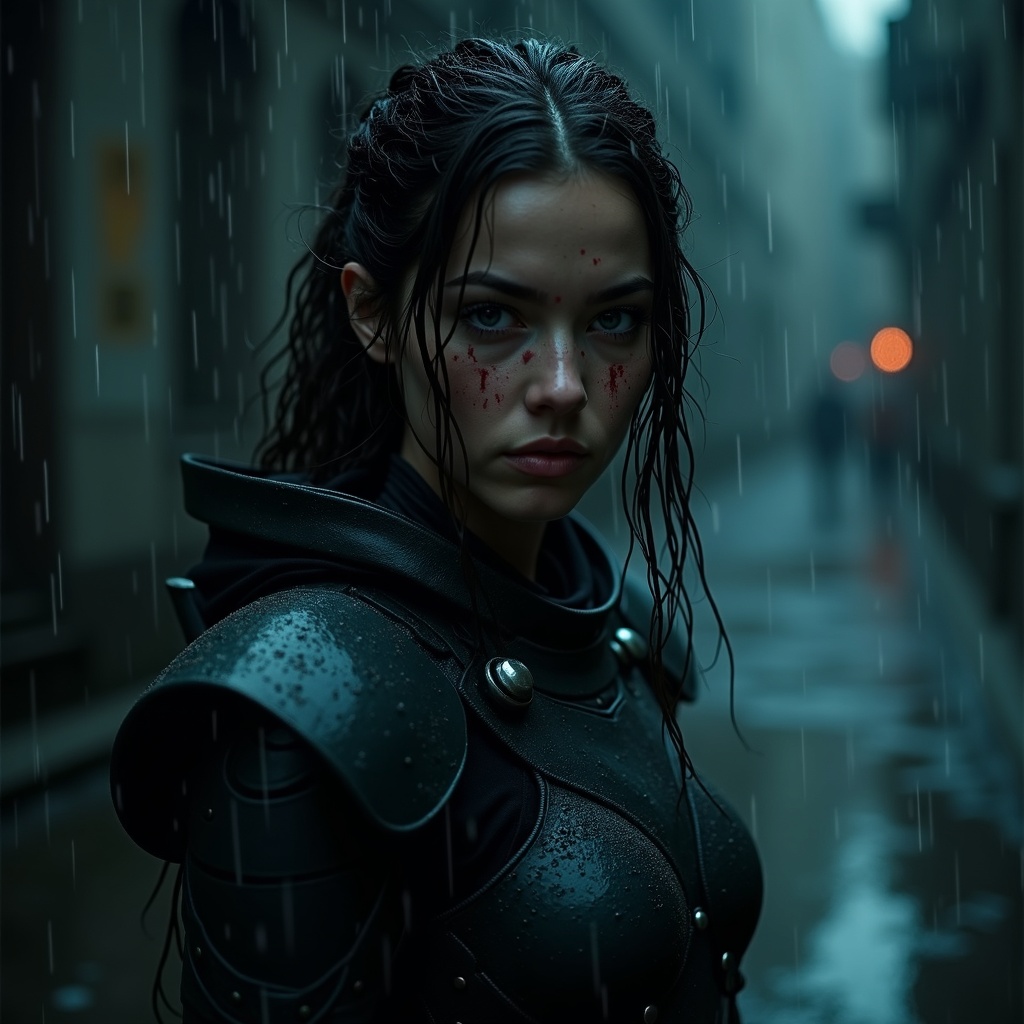 A young woman clad in futuristic armor stands amidst the pouring rain, her battle-worn suit bearing scars from an intense confrontation. The dark night sets the stage for this epic clash, her face etched with determination and grit, revealing the toll of the struggle. Each feature is captured in intricate detail, creating a cinematic masterpiece that feels alive. The environment around her is stunning and atmospheric, with the dim light reflecting off the puddles, highlighting the beauty of this hyperrealistic scene. The focus is sharp, the cinematic lighting casting dramatic shadows, while the faint glow of lumen reflections adds depth to this captivating tableau.