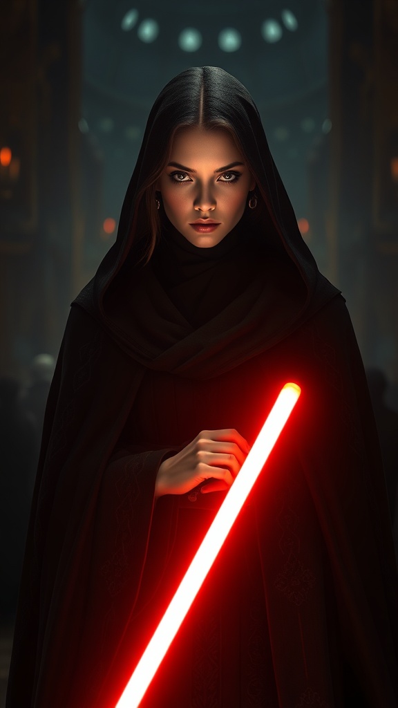 A lone woman stands, enveloped in dark, intricately detailed robes, set against the atmospheric backdrop of a Star Wars temple. With symmetrical eyes and dramatic lighting heightening the scene, her presence is strikingly realistic and reminiscent of a hyperrealistic photograph. The composition employs sharp focus and intricate, complex details synonymous with high-definition photography, akin to a cinematic poster of a Sith Lord. The full-body shot uses a wide-angle lens, accentuating ultra-detailed features that reflect stunning color grading and dynamic depth of field achieved via advanced rendering techniques like Unreal Engine and RTX. Illuminated by a mixture of natural, studio, and backlighting, the scene is rich in voluminous, moody light that enhances the ambient shadows and reflections. Global illumination and ray-tracing accentuate her presence with detailed reflections and ambient occlusion bringing every aspect to life. Her pose is dynamic, capturing a moment of hyper-detailed elegance and empowerment in this ultra-real photographic composition.