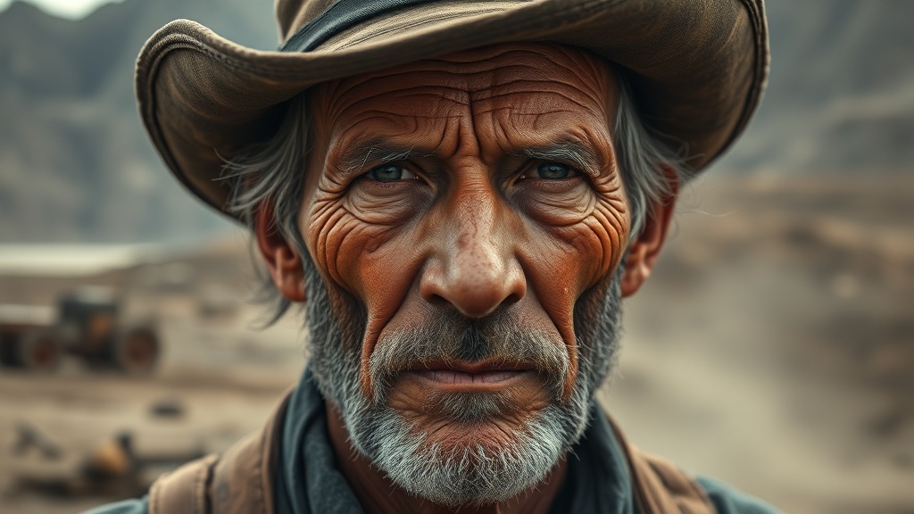 A stunning 8k painting of a weathered old coal miner from the 19th century, capturing the rugged essence of the wild west. The miner's face is portrayed with highly detailed craftsmanship, showcasing the lines and stories etched by years of labor, reminiscent of the styles of Greg Rutkowski and Magali Villeneuve. Set against a dramatic, expansive outdoor background, the miner stands resilient amidst the barren, dusty landscape. Soft, diffused lighting evokes a nostalgic, almost photographic quality, underscoring the miner’s grit and perseverance while introducing a subtle, artistic interpretation of the scene.