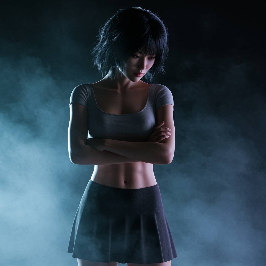 A young woman stands with arms crossed and a serious expression, gazing down at the ground in the nighttime. She is slender with defined abs and a flat chest, wearing an A-line skirt and a small crop top. Her black, shiny hair is short and messy. The image is ultra-realistic and elegant, with intricate details and sharp focus, creating a depth of field with f/1.8, using an 85mm lens for a medium shot. The scene is enhanced by volumetric fog, capturing the trending aesthetics of Instagram and Tumblr. The resolution is HDR 4k, showcasing the art in a high-quality format. The image features an Asian character with emphasis on realism and attention to detail, avoiding any distortions or low-quality elements.