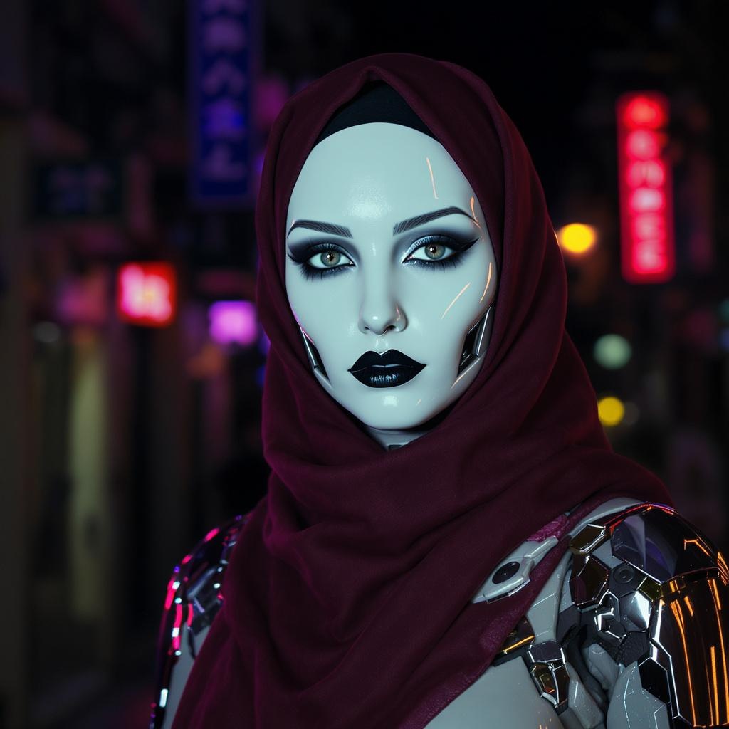A mid shot portrait of a cybernetic Arab woman as a plague doctor on a dimly lit street at night, featuring stunning cinematic photography. Her face is crafted from liquid glossy white plastic with an enigmatic dark crimson headscarf. The visage is marked by black lips and an expression of robotic allure. Showcasing a fusion of technological design with an essence of expressionism, the scene is enveloped in low-key lighting contrasted by vibrant neon hues. Her attire gleams with chrome plating, contributing to the hyper-realistic sci-fi aesthetic. The glossy finish of her appearance is accentuated by advanced ray tracing techniques, creating an immersive and striking visual narrative.
