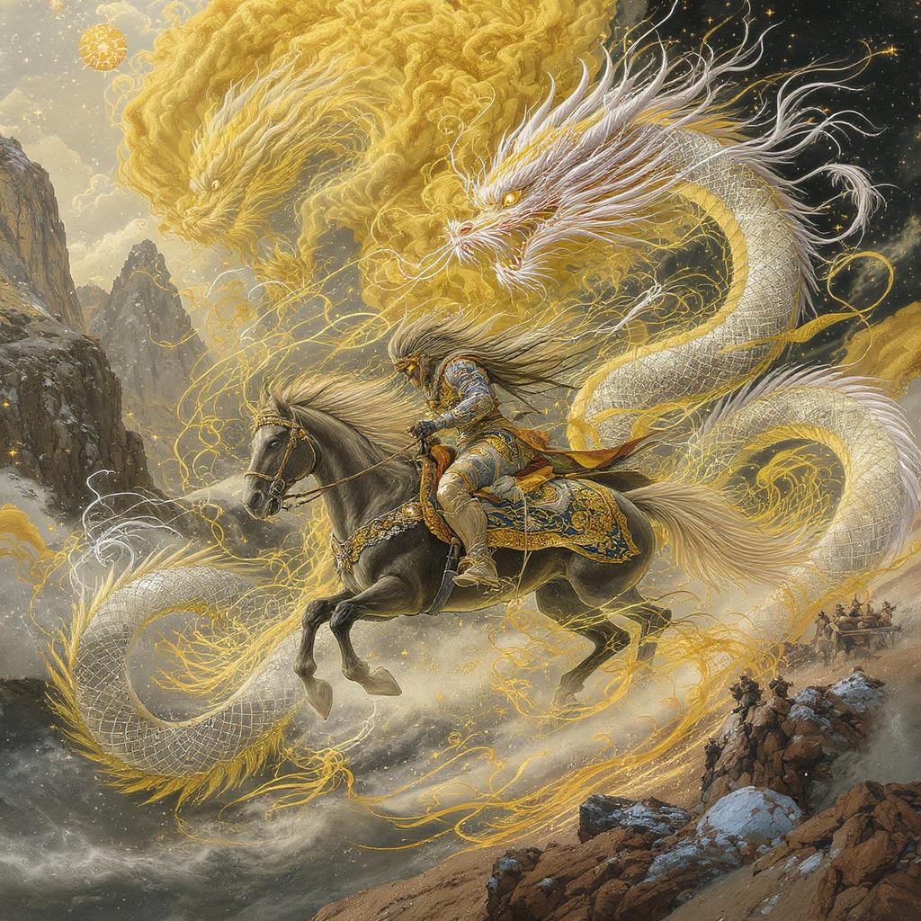 Horse rider galloping through a cinematic montage landscape, dragon art swirling around in intricate patterns, inspired by the style of Franciszek Starowieyski; vibrant hues of yellow and white weave through the scene, reminiscent of John Howe's hyper-realistic details. The composition is infused with elements of Himalayan art, capturing the majesty and mystery of ancient cultures; the fusion of reality and fantasy creates a breathtaking tableau -- a unique blend of dynamic movement and ethereal beauty.
