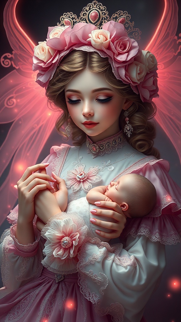 View this AI-generated image featuring portrait of a magical lolita girl dreamy and ethereal with a peaceful expression adorned in an ornate and frilly dress that exudes fantasy and elegance she gently holds a cute baby in her hand radiating an atmosphere of tranquility this digital painting is high