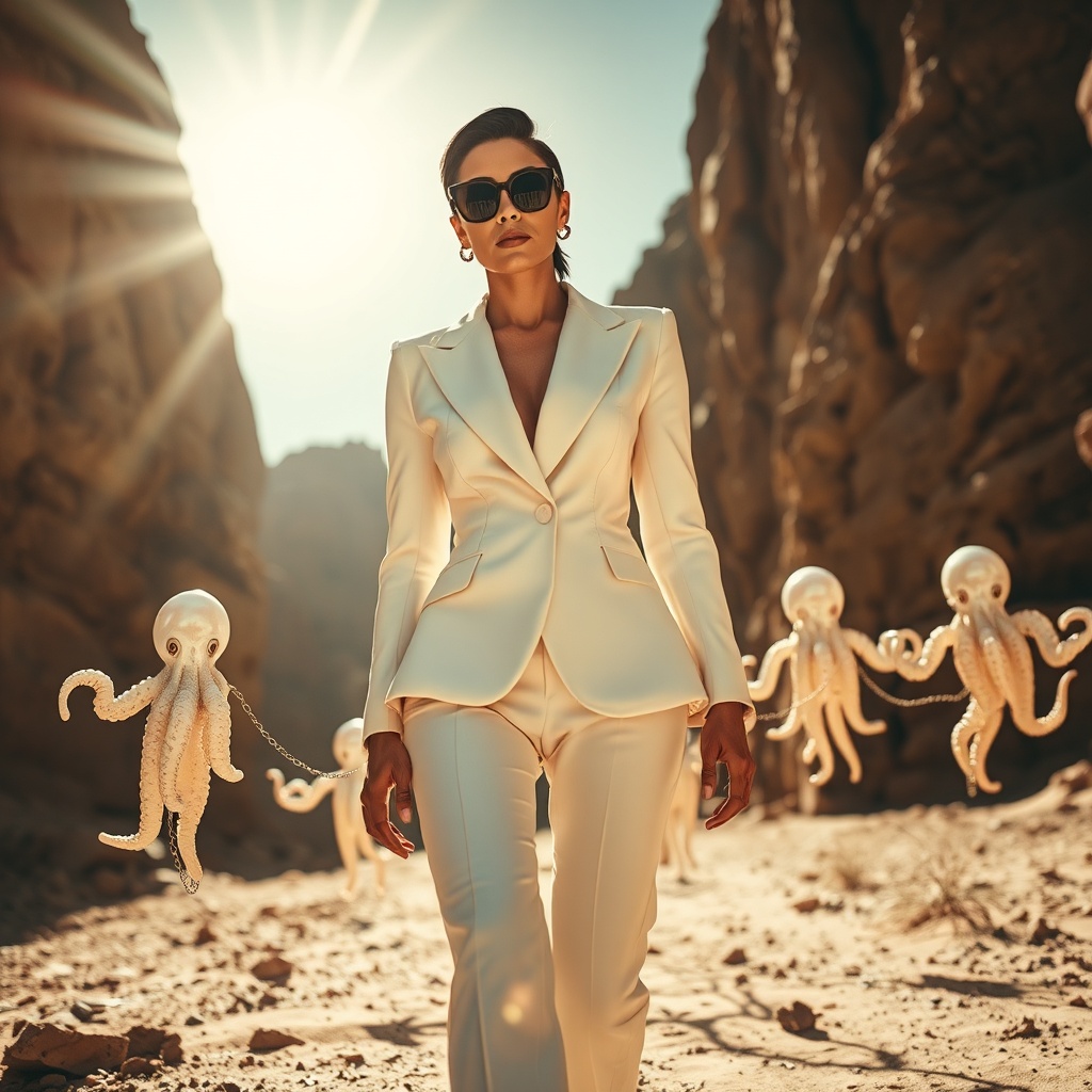 In a rocky desert landscape, under the harsh midday sun casting strong shadows, a powerful scene unfolds. A dramatic, dusty atmosphere pervades the setting, marked by towering rocky cliffs and a rugged, dusty terrain. A woman strides forward confidently, her expression serious and focused, eyes fixed ahead. She wears a white tailored suit, structured and elegant, complemented by dark sunglasses and small hoop earrings. Her dark hair is slicked back, adding to her commanding presence. Beside her, six surreal, octopus-like beings float gracefully, their pearly, iridescent skin glinting in the sunlight. Each creature is led by a delicate chain leash, their tentacles creating fluid, mesmerizing patterns in the air. The ensemble emits an avant-garde, otherworldly elegance that bridges fashion and fantasy. The scene is captured from a low, frontal angle, using a wide-angle lens to encapsulate the full-body of both the woman and her fantastical companions. The sunlight, streaming from above and slightly behind, produces high contrast and long shadows that add depth and drama to the image. The focus remains sharp on the woman, hinting at her dominance and power, while the background is slightly blurred, enhancing the surreal, editorial aesthetic of this cinematic moment. Embracing a compelling science fiction crossover, the mood exudes a blend of mystery and authority, embodied in a vibrant yet sleek color palette.