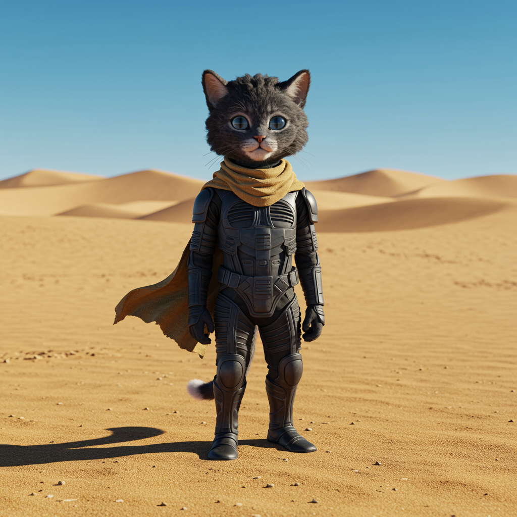 In a vast, arid desert landscape under a vivid blue sky, an anthropomorphic, endearing feline figure stands poised as Paul Atreides. With dark curly fur cascading around its face like hair, the charming cat dons sleek, full-body armor with intricate detailing, paired with a flowing, sand-hued scarf elegantly wrapped around its neck. Its luminous eyes gaze intently into the distance, embodying a sense of purpose and adventure. Captured with the Sony A7 III camera using a Canon RF 24-70mm f/5 L IS USM lens, the scene is rendered in an ultrawide, hyper-detailed shot, with the desert sands sprawling endlessly behind, casting dramatic shadows and highlighting the harsh yet stunning beauty of the extraterrestrial dunes of Planet Denis. Small grains of sand and features of the terrain are captured in exquisite detail, adding depth and realism to the stunning scenery.