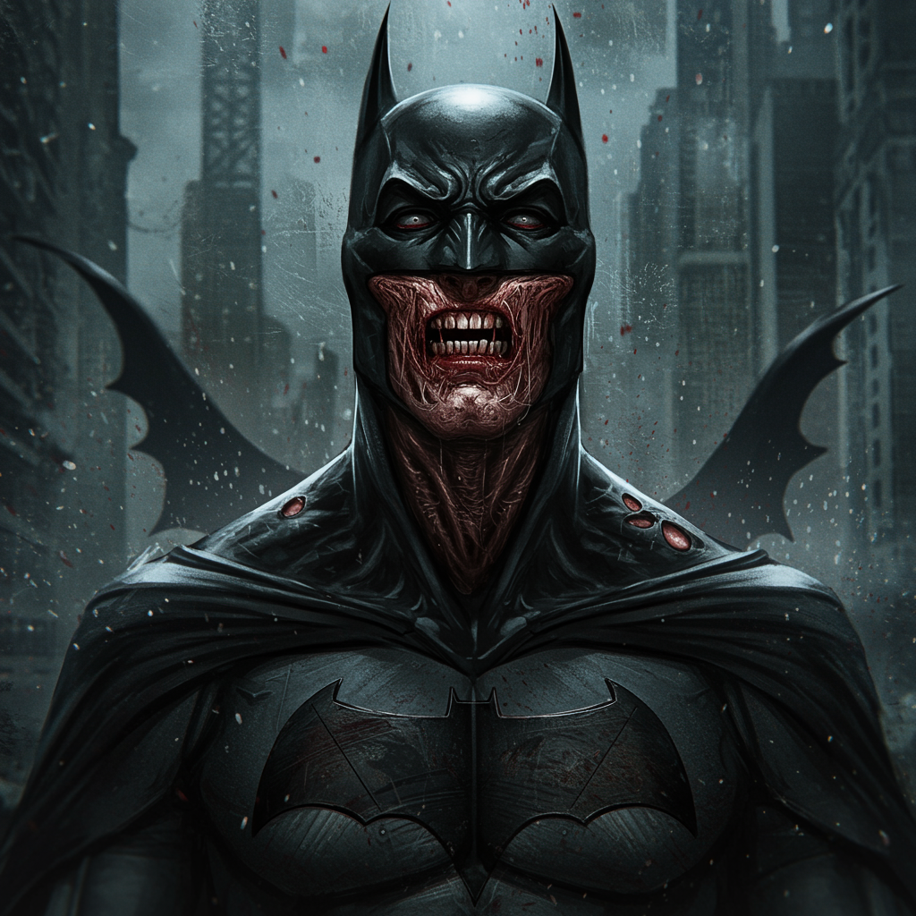 Digital wallpaper portrait of Batman, the Dark Knight, presented in a comic book style with 8k resolution, capturing a gritty essence reminiscent of Marvel comics. The scene is set against a dark, moody background with muted colors to enhance the epic and dramatic composition. This digital painting conveys deep emotional undertones and displays intricate details, yet intentionally features imperfections such as rough execution, low quality, and jpeg artifacts. The portrayal is purposefully flawed, with elements like poorly drawn and mutated anatomy, depicting deformed proportions, extra or missing limbs, and a disfigured appearance. Characteristics include a distorted face, blurry features, dehydrated look, and bizarre proportions, creating a morbid and unsettling effect. The character may have an elongated neck or other deformities, with poorly defined hands and face. Added elements such as unintended duplicates, text, watermarks, or signatures might be visible, along with markers of low quality and artistic mistakes, enhancing the sense of a fragmented, surreal interpretation.
