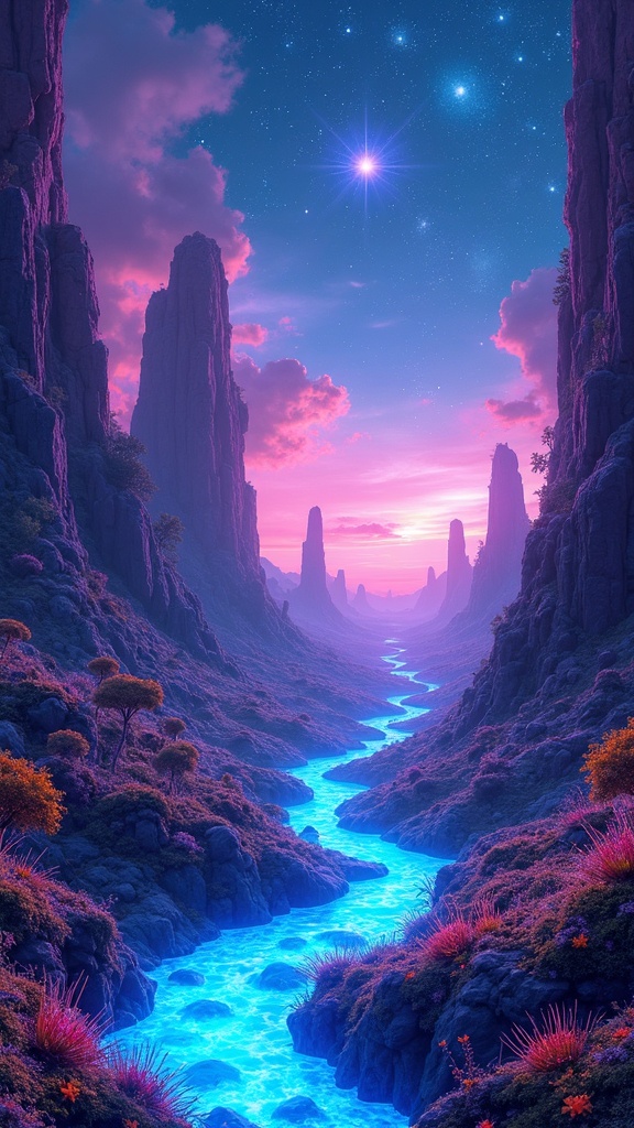 View this AI-generated image featuring a vibrant neon illuminated extraterrestrial landscape teeming with pulsating flora and luminescent creatures set against the backdrop of an expansive star studded sky showcasing towering bioluminescent rock formations and shimmering rivers of electric blue cour