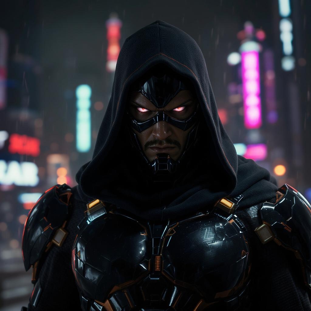View this AI-generated image featuring donny yen portrayed as a futuristic supervillain cloaked in an intricately designed black armor set against a neon lit cityscape hyperrealistic and photorealistic detailing 8k resolution rendered with unreal engine precision his piercing gaze and enigmatic expr