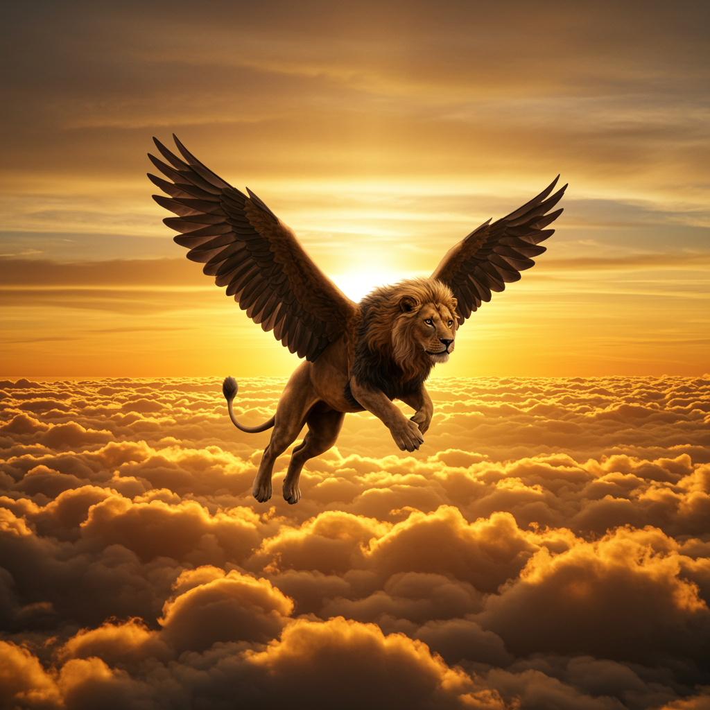 A majestic winged lion soars gracefully above shimmering golden clouds, captured in stunning detail through a high-end DSLR camera, set against the backdrop of a breathtaking sunset. The cinematic lighting casts a warm glow over the scene, highlighting the lion's powerful wings and regal mane as it effortlessly glides through the sky.