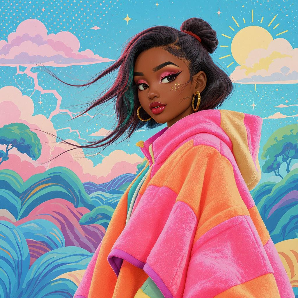 A colorful digital artwork of a woman in a contemporary poncho jacket reflecting the vibrant style of Duro Olowu, combined with Yanjun Cheng's influence. The scene has a touch of the lofi girl internet meme, with a design that could trend on Dezeen. This piece resembles a catalog photo but is a 3D render in the playful, imaginative style of Beeple, Rhads, and Lois van Baarle. The cartoon-style illustration is in bright pastel hues, featuring a retro anime girl vibe, blending beauty and creativity in a harmonious way.