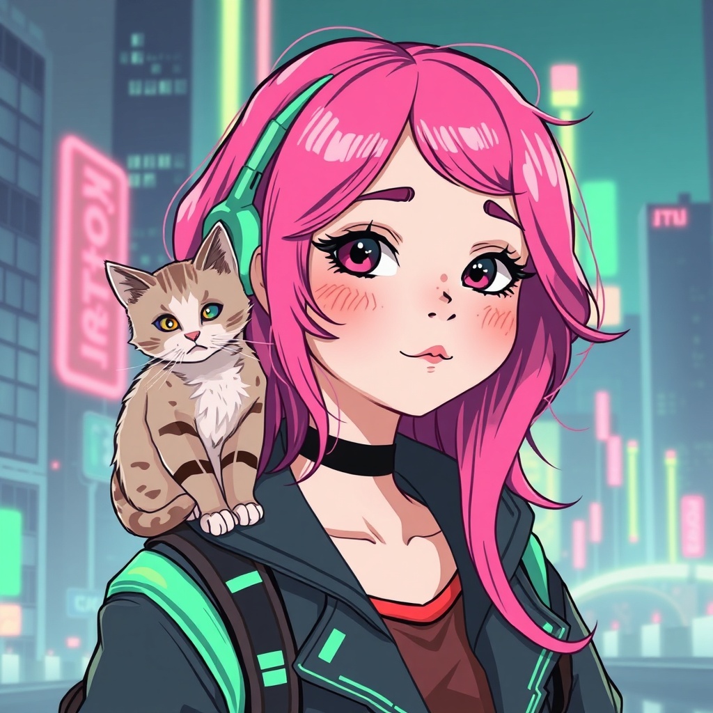 View this AI-generated image featuring an illustration of a whimsical girl with vibrant pink hair depicted in flat shading style inspired by gemma correll she has playful freckles scattered across her cheeks and a curious cat perched on her shoulder the scene embraces a cyberpunk theme incorporating