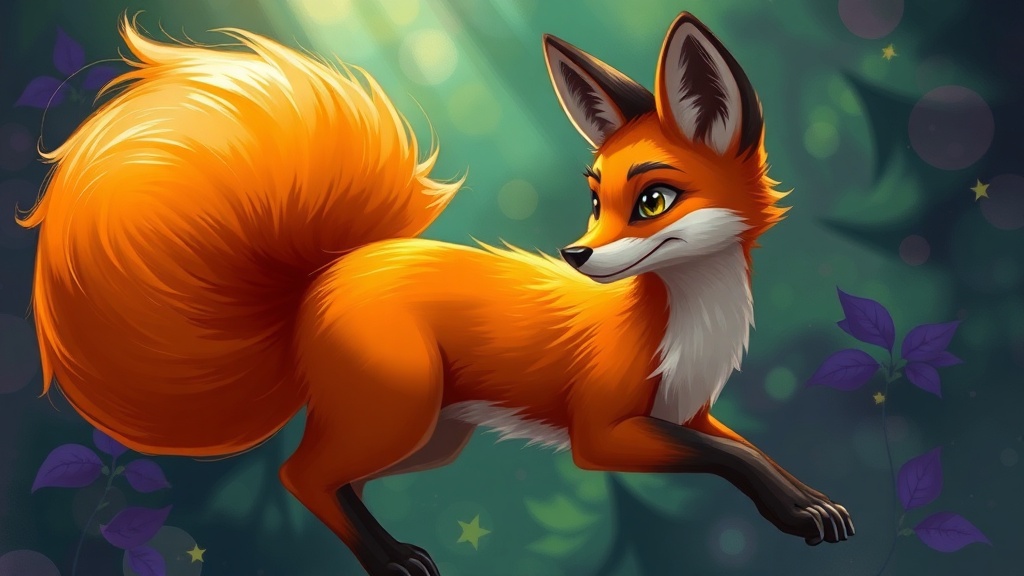 A real, animated fox with a sleek, fiery orange coat that glistens in the sunlight, its fur detailed and sharp, embodying both elegance and agility. Its bushy tail swirls around, tinged with cool blue accents, reminiscent of a gentle flame that flickers with each graceful movement. Bright, intelligent eyes reflect a sense of curiosity and wisdom, capturing the essence of exploration and freedom. This majestic creature seems to possess an ethereal glow, as if touched by the spirit of the forest, embodying both the warmth of fire and the calm of the earth. The background is a vibrant, abstract blend of forest greens and twilight purples, suggesting a world full of possibilities and discovery.