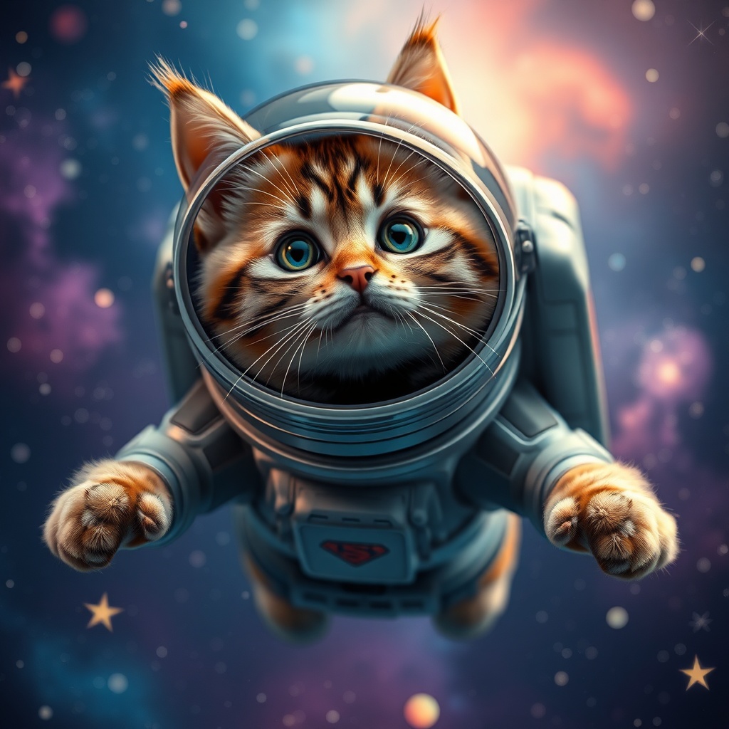 Ultra-High-Definition image of an adorable cat wearing a detailed, futuristic space suit, floating in a cosmic backdrop with a twinkle in its curious eyes, surrounded by shimmering stars and vibrant hues of nebulae.