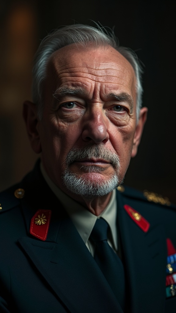 A striking close-up portrait of a 62-year-old formidable and highly decorated general, with a clean-shaven face exhibiting a serious and stoic expression. The cinematic and epic composition enhances intricate details, captured in rich 4k resolution on Kodak film. The atmosphere is dark and moody, with a beautifully detailed bokeh background that complements the character's commanding presence, evoking an HBO-style production.