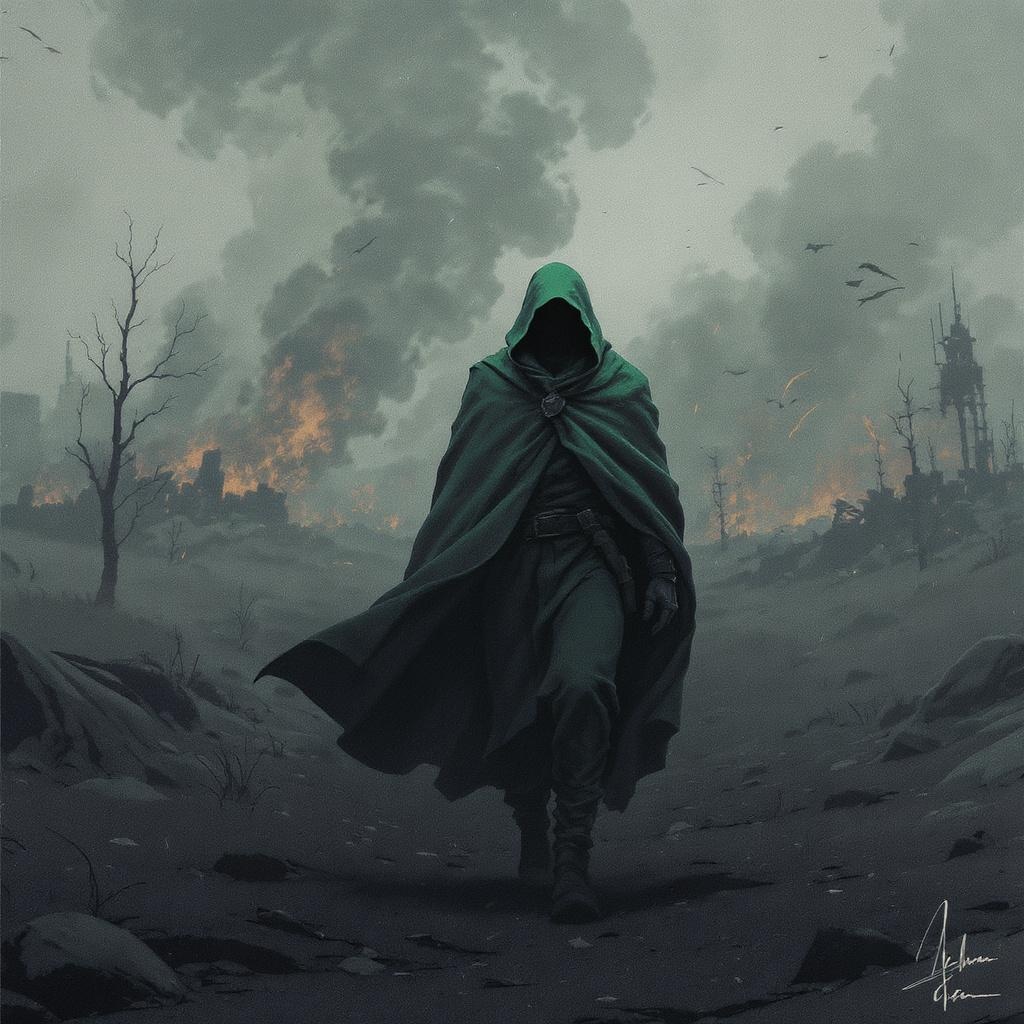 Man adorned in a green cloak strides purposefully, a smoldering city in ruins behind him, signaling the dawn of chaos. Though the world crumbles, he walks with unwavering confidence towards us. The scene is enveloped in a monochromatic haze, with low-resolution details and a blur that soften the edges. His eyes are indistinct, adding to the enigmatic aura. The off-kilter proportions and asymmetric features invoke a surreal, almost otherworldly presence. Despite the ambiguity of his form and the imperfections surrounding him, he remains a striking figure amidst the apocalyptic backdrop.