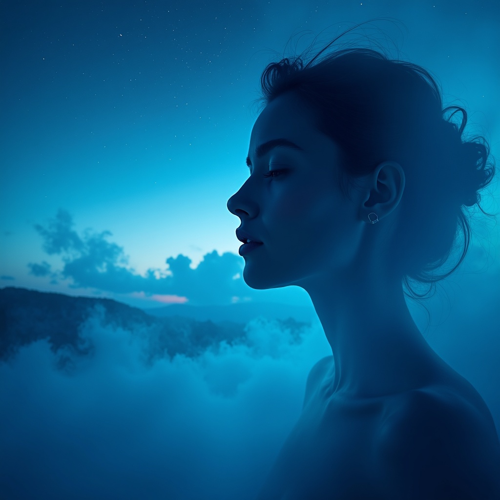 Surreal semi-realistic landscape photograph with cool blue to dark gradients and muted soft tones, featuring a dark blue to light blue midnight gradient just after sunset during the blue hour twilight. The scene showcases an ethereal double exposure style, highlighting the profile of a serene female figure with smooth, luminous skin. Surrounding her is a large, wispy wave of translucent shapes reminiscent of mare's tail cirrus clouds, blending seamlessly into a star-filled night sky. The color palette is a harmonious blend of contrasting shades of blue and diffused muted hues, creating a dark and emotionally charged atmosphere. The background features a deep gradient, enhancing the scene's powerful and tumultuous quality. The composition is balanced yet powerful, with intricate details conveying a sense of elemental power and a cool, luminous glow. The image offers a serene, meditative tone, rich in color and detail, with small creative modifications to maintain its core essence.