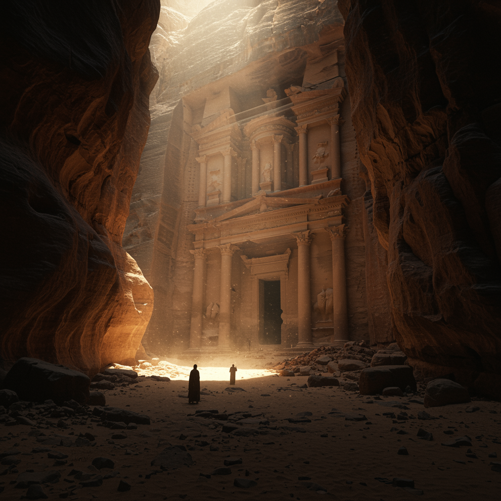 A majestic and mysterious Sumerian Temple, long hidden within the rugged embrace of a canyon wall, lies in ruins. The entrance, partially obscured by scattered debris, hints at ancient secrets waiting to be uncovered. This cinematic scene unfolds in a vast desert landscape, where shadows dance in the depths of a dark canyon, illuminated by striking rays of light penetrating from above. The style echoes the grandeur of Petra, with its grandiose structures seamlessly integrated into nature. The atmosphere is enhanced with volumetric lighting, creating a mesmerizing interplay of light and shadow. Dust particles float delicately in the air, adding to the timeless aura of the setting. The image is captured in breathtaking 16k UHD HDR, offering extraordinary detail and richness. The scene invites exploration, as undisturbed illusions of ancient times whisper stories of a bygone era, waiting for modern eyes to appreciate their historic beauty.