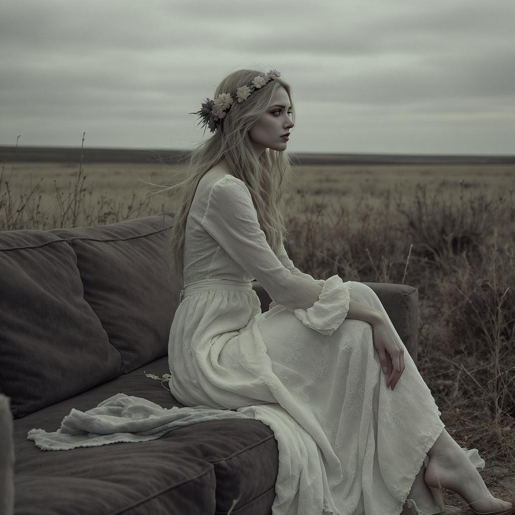 A captivating woman sits atop a couch in a vast field, a slender girl in a flowing white boho dress reminiscent of Lalisa Manobal. Her long blonde hair cascades down her back, exuding an ethereal flowerpunk charm. With a feral yet languid presence, she gazes into the barren landscape, echoing the mystique of Imogen Poots. Her delicate frame contrasts beautifully with the desolate surroundings, creating a scene of haunting allure.