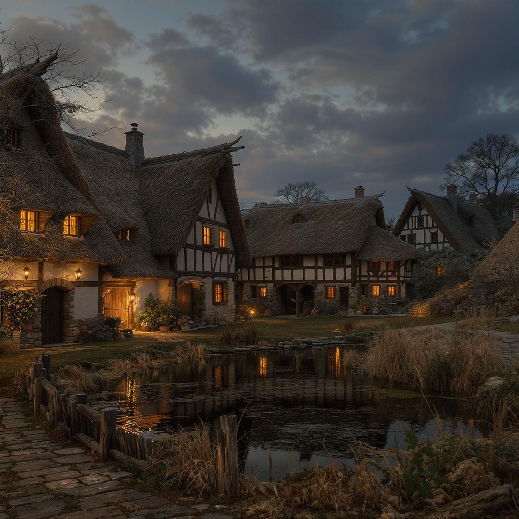 View this AI-generated image featuring medieval serf dwellings with timber framed structures and straw thatched roofs gathered around a shared pond exuding a rustic allure under the soft glow of twilight intricately detailed with a pastoral charm reminiscent of a vermeer masterpiece captured in phot