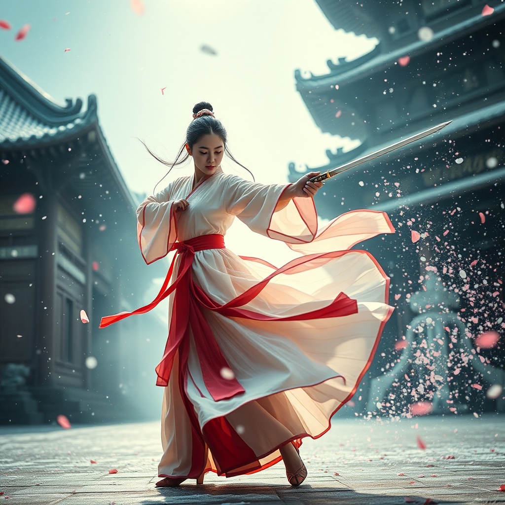A 16-year-old Chinese girl, dressed in exquisite Hanfu, twirls gracefully amidst a whirlwind of snow and petals, her sword glinting in the ethereal light. She stands poised at the heart of an ancient temple, the air alive with vibrant, colorful orbs of light reminiscent of a Chinese fairy tale. Her movements are fluid yet powerful, embodying the art of martial skills as she defends herself against unseen forces. The scene captures a captivating contrast of delicate beauty and fierce strength, set against an epic, cinematic backdrop. Soft, dramatic lighting casts realistic shadows, emphasizing the intense focus and elegance of her performance, reminiscent of a stunning 35mm shot that draws you into its vivid and dynamic world.