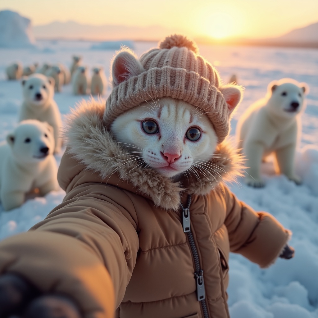 A fluffy kitten with big bright eyes, wrapped snugly in a cozy brown down jacket and matching hat, poses for a selfie amidst an icy landscape. Around the kitten, more than a dozen tiny snow-white polar bears curiously interact, their fur glistening under the warm glow of the setting sun. Each bear, with its playful demeanor, adds to the whimsical charm as the sunset's golden light casts a gentle shimmer across the scene, highlighting every intricate detail of the frosty environment.