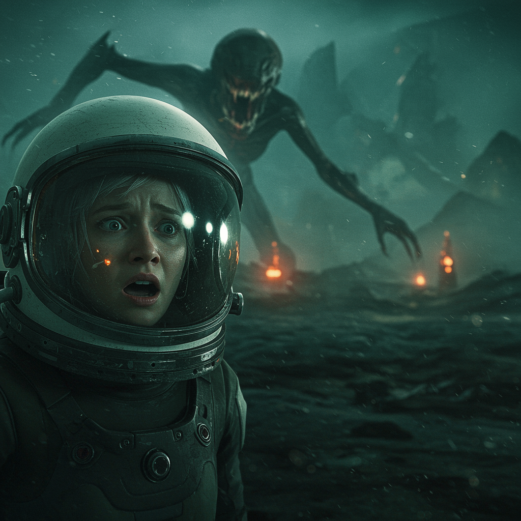 A terrified astronaut peers through the visor of her helmet, eyes wide with fear as a menacing creature looms behind her on the desolate, alien landscape. Shadows stretch across the uneven terrain, and the air hangs heavy with a damp, foreboding mist, casting an eerie chill over the scene. The alien planet, with its stark and otherworldly ambiance, seems to amplify the astronaut's sense of dread, as dim, flickering lights illuminate grotesque, twisted structures in the distance.