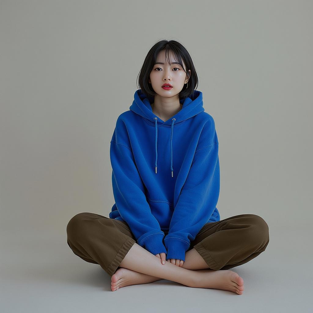 Photography session featuring a Korean female model with a natural, soft expression and light black bobbed hairstyle. The contemporary photoshoot takes place within a minimalist set. The model sits comfortably and naturally on the floor, elegantly dressed in a vibrant blue, oversized hoodie paired with dark khaki capri pants. She is barefoot, with a relaxed posture. The neutral background enhances the scene, while soft and diffused lighting creates gentle shadows, emphasizing her graceful pose. The setting captures an ultra-detailed, raw aesthetic, showcasing the model’s serene presence and the simplicity of the environment in 16K resolution.