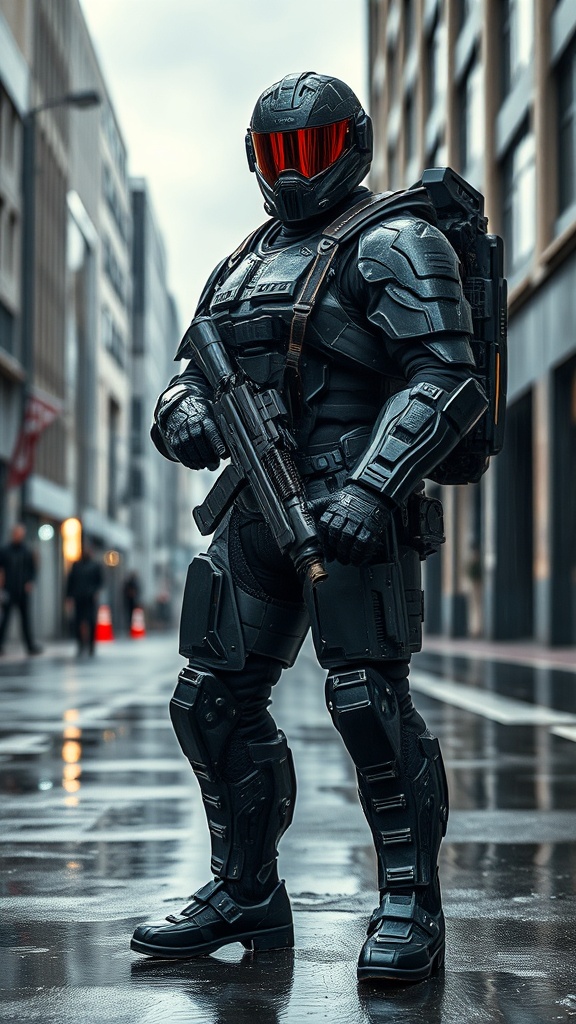 View this AI-generated image featuring a heavily armored futuristic soldier equipped with cutting edge weaponry and high tech accessories stands poised on a rain slick urban street under an overcast sky the intricate design of their armor is a marvel of engineering featuring an array of details that