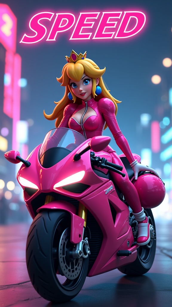 A breathtaking, ultra-realistic illustration of Princess Peach on a sleek pink Mario Kart-style racing bike, designed with Fast and Furious inspiration. She wears a chic pink sports suit with white accents, holding a matching helmet in her right hand. The backdrop displays a vibrant nighttime cityscape illuminated with neon lights, exuding a dark, fantastical atmosphere. The words "Mario Kart SPEED" are prominently featured at the top, creating a cinematic ambiance. The high-resolution image, paired with bold typography, delivers an unforgettable visual impact.