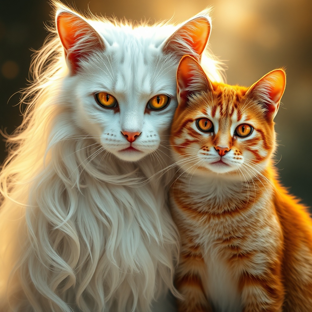 Photographic portrait of a white feline enchantress, her cascading silvery-gold hair framing a face with eyes the color of liquid amber, as if they've captured the warm afternoon sun, standing gracefully amidst her mystical realm. Beside her stands her enchanted companion, a vibrant ginger cat with eyes aflame in a fierce shade of crimson, embodying the intensity and unpredictability of a wildfire, cloaked in a sleek, silky fur coat that mirrors the monochrome elegance they share. The digital rendering captures every strand of fur in high definition, with soft ambient lighting and nuanced volumetric effects to create a profound sense of depth and ethereal atmosphere, punctuated by subtle creative nuances.